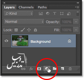 سومین روش برای افزودن لایه ی Brightness/Contrast adjustment کلیک کردن روی ایکون New Fill or Adjustment Layer در پایین پنل لایه ها :