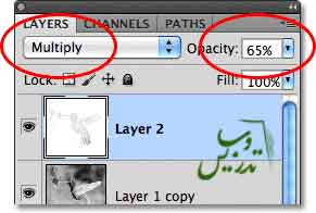 نوع ترکیبی لایه Layer 2 را از Normal به Multiply تغییر دهید این کار خطوط نقاشی را تیره می کند. اگر نتیجه کار زیادی تیره شد کافیست که Opacity=60% لایه را کم کنید ممکن است تصویر شما به اندازه دیگری از این تنظیمات نیاز داشته باشد.