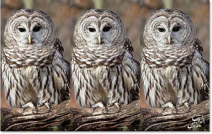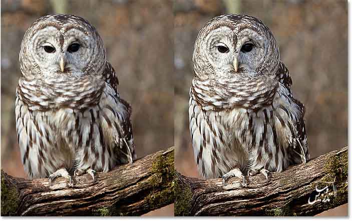 با اینکار پر ها و قسمت های دیگر جغد نمایان تر شده و قسمت ی از شاخه درخت ولی باقی تصوی به نظر فتوشاپ لبه ای نداره و کاملا خاکستری مونده: