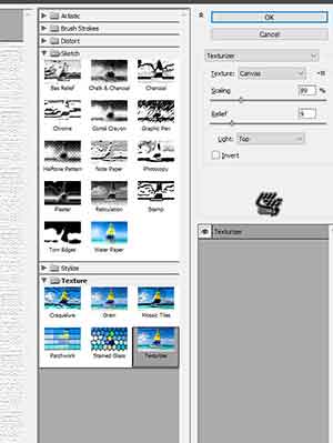 Ctrl + Shift + Alt + Nمیتواند اینکار را بسرعت انجام دهد سپس لایه را با رنگ سفید پر کنید کلید میانبر Dو سپس Ctrl+backspaceرا بزنید. پنجره فیلتر گالری را باز کنید از دستور Filter > Filter Galleryبرای اینکار استفاده کنید . و سپس از پوشه Textureگزینه texturizerرا انتخاب و تنظیمات را بصورت Scale=89و relief=9 انجام دهید. اینکار یک بافت زیبا به شما خواهد داد.
