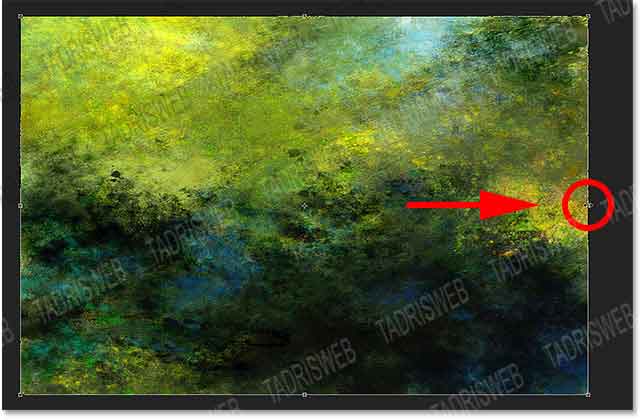 اینکار دستگیره های ابزار را بدور لایه ایجاد می کند دستگیره سمت راست را بگیرید و به منتها الیه سمت راست بکشید ما معمولا از این کار پرهیز می کنیم چرا که نسبت های عکس و کیفیت آن از بین میرود ولی در اینجا این لایه فقط نقش بافت را بازی خواهد کرد این مسئله اهمیتی ندارد: