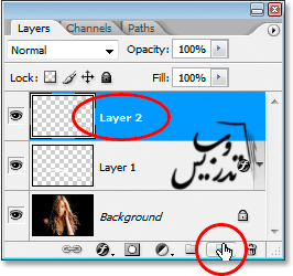 با کلیک کردن روی ایکن ایجاد لایه در پالت لایه ها شما یک لایه ی جدید با نام Layer 2در بالای لایه ی قبلی یعنی Layer 1خواهید داشت: