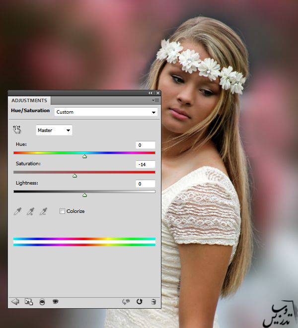 دستور Layer > New Adjustment Layer > Hue/Saturation را اجرا کرده و آن را روی Clipping Mask تنظیم کرده و Saturation=-14 بگذارید. اگر با درک این مراحل مشکلی دارید به صفحه آموزش فتوشاپ آموزش های مقدماتی مراجعه کنید.