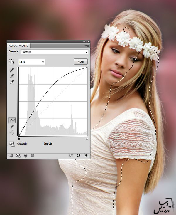 یک لایه ی Curves adjustment را برای روشن تر کردن تصویر مدل استفاده کنید قسمت های انتخاب شده در تصویر را با ماسک لایه سیاه کنید. هدف ما روشن کردن قسمت های پشتی تصویر است.