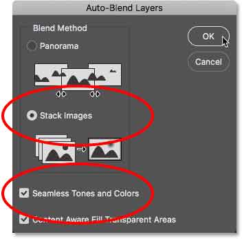 روی گزینه "Stack Images" کلیک کنید. و مطمئن شوید گزینه "Seamless Tones and Colors"انتخاب شده است، اگر از فتوشاپ "CC"استفاده می کنید گزینه ای به نام "Content Aware Fill Transparent Areas"خواهید دید که مناطق خالی تصویر را برای شما پر می کند، در انتها ما تصویر خود را برش خواهیم داد بنابراین نواحی اطراف عکس چندان برایمان مهم نیست :