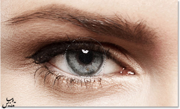 در حالیکه ابزار Elliptical Marquee را در دست دارید. روی وسط سیاهی چشم کلیک کنید. برای شروع کشیدن دایره از دکمه shift+Alt استفاده کنید. نگه داشتن کلید Shift به شما یک دایره کامل خواهد داد و نگهداشتن کلید Alt باعث می شود دایره به سمت خارج مرکزی که کلیک کرده بودید بزرگ شود. انتخاب را کمی بزرگتر از قسمت رنگی چشم انجام دهید موس را رها کرده و سپس کلید های کمکی را هم رها کنید .