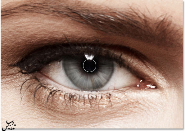 بقیه مراحل مو به مو یکی هستند. از گام 4 شروع کنید و تا انتهای گام 9 به پیش روید. از ابزار Elliptical Marquee برای کشیدن دایره ی کمی بزرگتر از قسمت رنگی چشم استفاده کرده . و فیلتر نویز را به آن اعمال کنید. و سپس محو شدگی خطی را اجرا کنید. که از فیلتر Radial Blur برای اینکار استفاده خواهید کرد. از ماسک لایه برای حذف کردن قسمت های ناخواسته استفاده کنید. و تمام قسمت های که وارد پلک و سیاهی چشم و سفیدی چشم شده را حذف کنید.در پایان باید تصویر شما شبیه شکل زیر شده باشد.