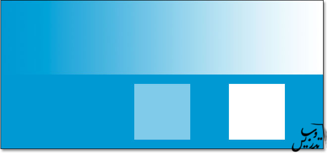 بار دیگر اگر به پالت لایه های من نگاهی به پالت لایه های من بیاندازید متوجه می شوید که چطور این لایه ها ایجاد شده اند . در واقع یک رنگ آبی خالص تمام لایه ی پس زمینه را پوشانده است و یک لایه با نوع ترکیبی normal در بالای آن شامل یک گرادیانت سیاه به سفید از سمت چپ به راست و سه مربع به رنگ های اولی از سمت چپ سیاه خالص وسطی خاکستری 50% و سمت راستی سفید خالص من این لایه را Gradient and Squares گذاشتم . و همانطور که میبینید تمام این اجزا همانطور که انتضار داریم دیده می شوند. و لایه بالای لایه بکگراند را کاملا می پوشاند.
