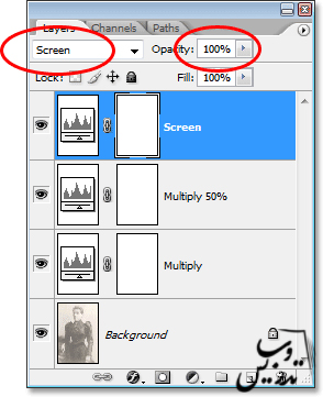 یادتان باشد که یک کپی از لایه همواره ویژگی های ان مانند نوع ترکیب و میزان opacity را دارد بنابراین من الان یک لایه Screen دارم که نوع ترکیب آن Multiply است و میزان opacity=50% است . خوب بهتر است که این مشکل هر چه سریعتر حل شود میزان opacity را بالا ببرید و نوع ترکیب لایه را به Screen بدل کنید . حالا باید لایه Screen نوع ترکیب لایه Screen و opacity=100% داشته باشد.